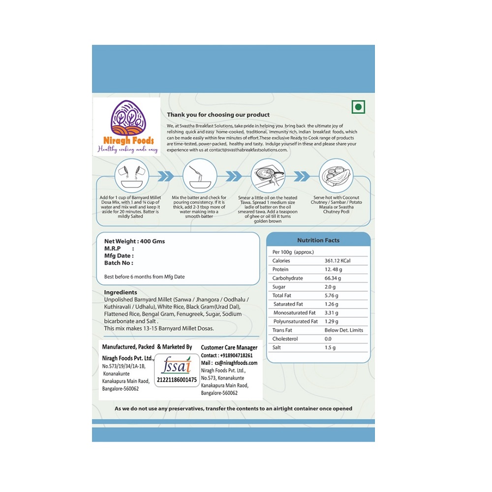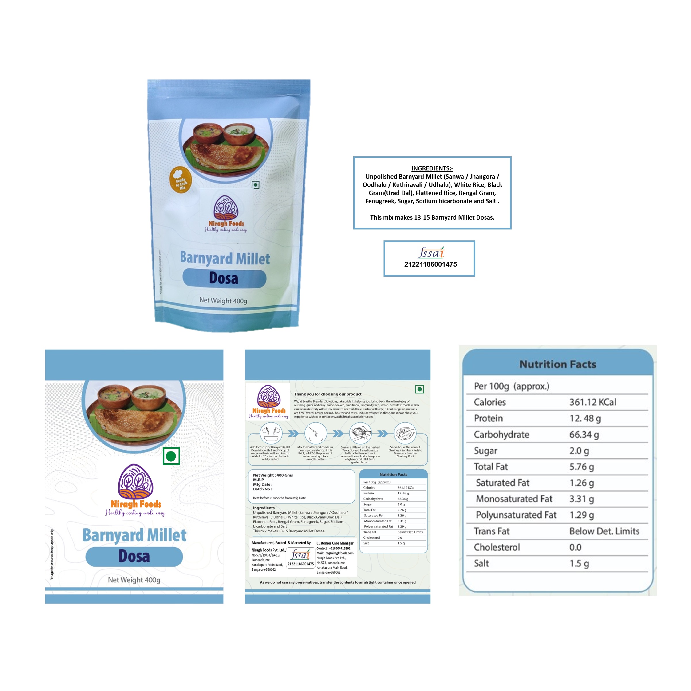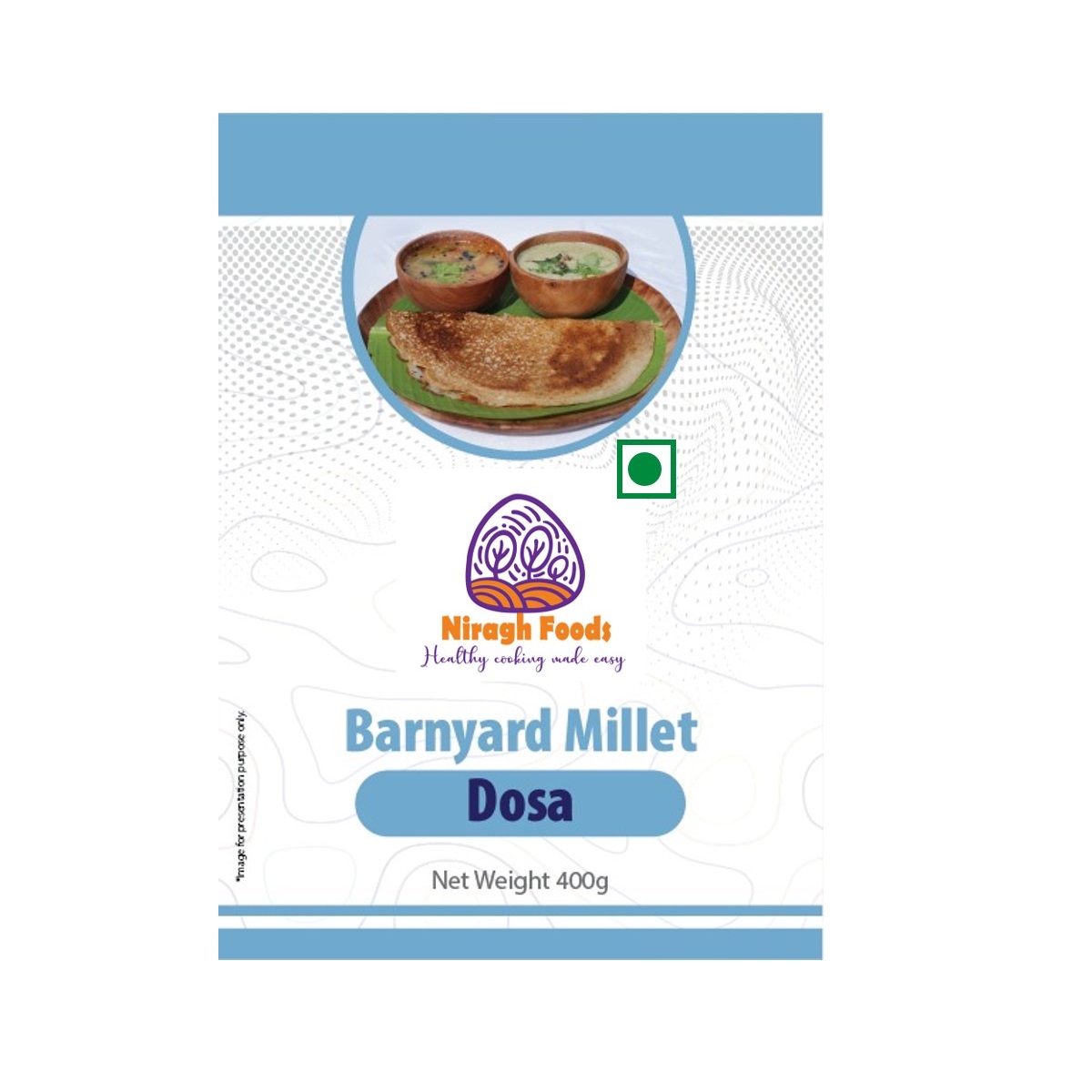Enjoy the protein rich, crispy dosas any time of the day. In Niragh Foods we prepare the dosa batter traditional way, stone ground and fermented , then using proprietary technology we make dry powder with utmost care retaining the taste and nutrients of the batter using state of the art modern machinery. All you have to do is add the amount of water mentioned on the pack, and mix it without any lumps into smooth consistency, in few minutes you get batter which as good as fresh batter with right pH. So with Niragh Foods Dosa mix, you get the authentic taste as well as the goodness of Barnyard Millet / Udalu along with Urad dal and other nutrient rich grains.