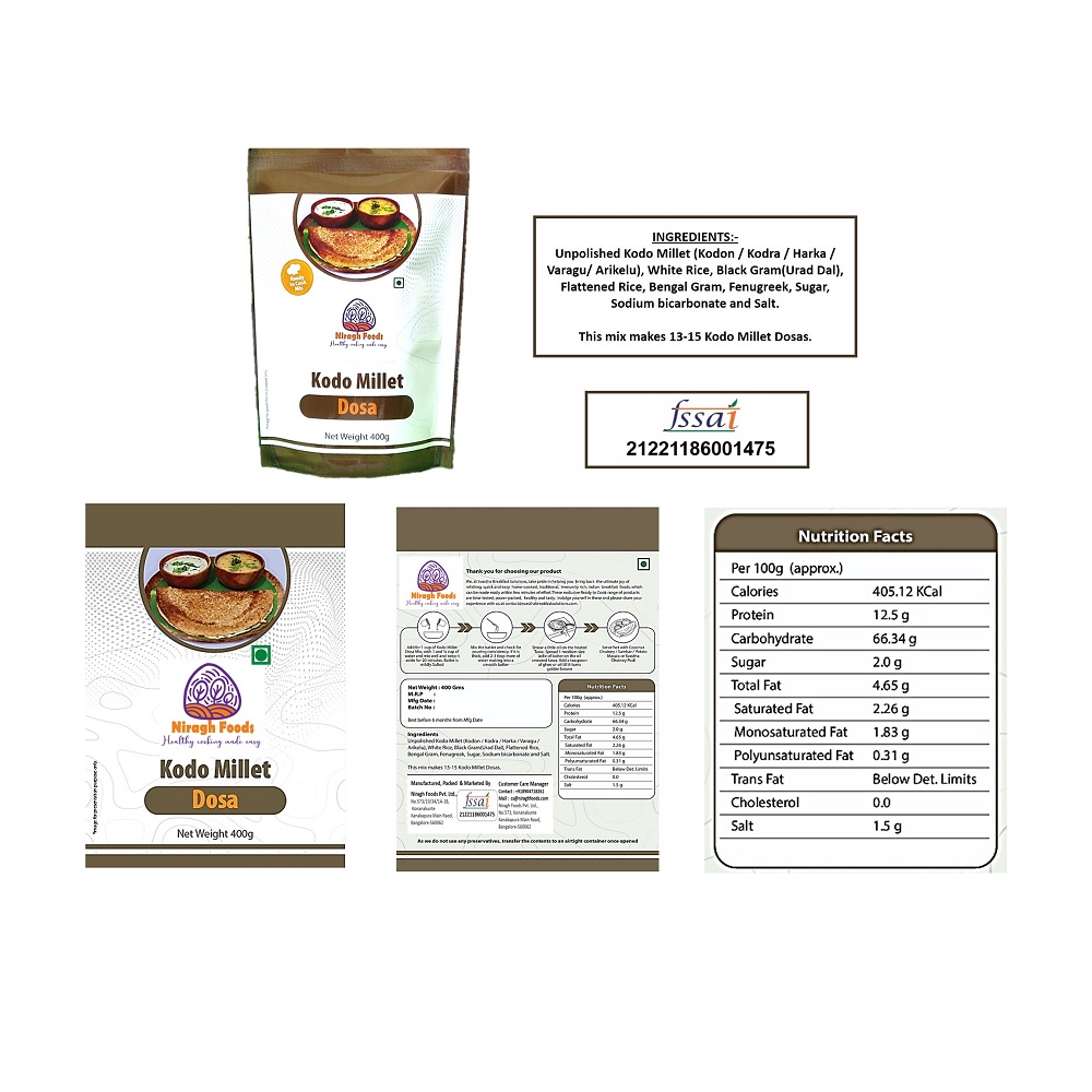 Enjoy the protein rich, crispy dosas any time of the day. In Niragh Foods we prepare the dosa batter traditional way, stone ground and fermented , then using proprietary technology we make dry powder with utmost care retaining the taste and nutrients of the batter using state of the art modern machinery. All you have to do is add the amount of water mentioned on the pack, and mix it without any lumps into smooth consistency, in few minutes you get batter which is as good as fresh batter with right pH. So with Niragh Foods Dosa mix, you get the authentic taste as well as the goodness of Kodo millet along with Urad dal and other nutrient rich grains.