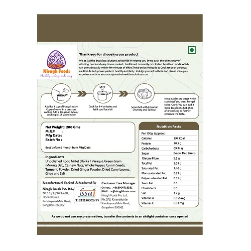 At Niragh Foods we prepare the mix, after carefully choosing the right quality grains, which then thoroughly washed and finally rinsed in RO water , before going through the de-hydration process in the state of the art dehydrators. So with Niragh Foods Pongal mix, you are not only saving lot of cooking time, and also be assured that you are giving yourself and your family hygienically prepared traditional home made dish, with the authentic taste as well.