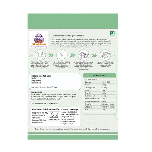 In Niragh Foods we prepare the dosa batter traditional way, stone ground and fermented , then using proprietary technology we make dry powder with utmost care retaining the taste and nutrients of the batter using state of the art modern machinery. All you have to do is add the amount of water mentioned on the pack, and mix it without any lumps into smooth consistency, in few minutes you get batter which as good as fresh batter with right pH. So with Niragh Foods Dosa mix, you get the authentic taste as well as the goodness of Pearl Millet / Bajra along with Urad dal and other nutrient rich grains.